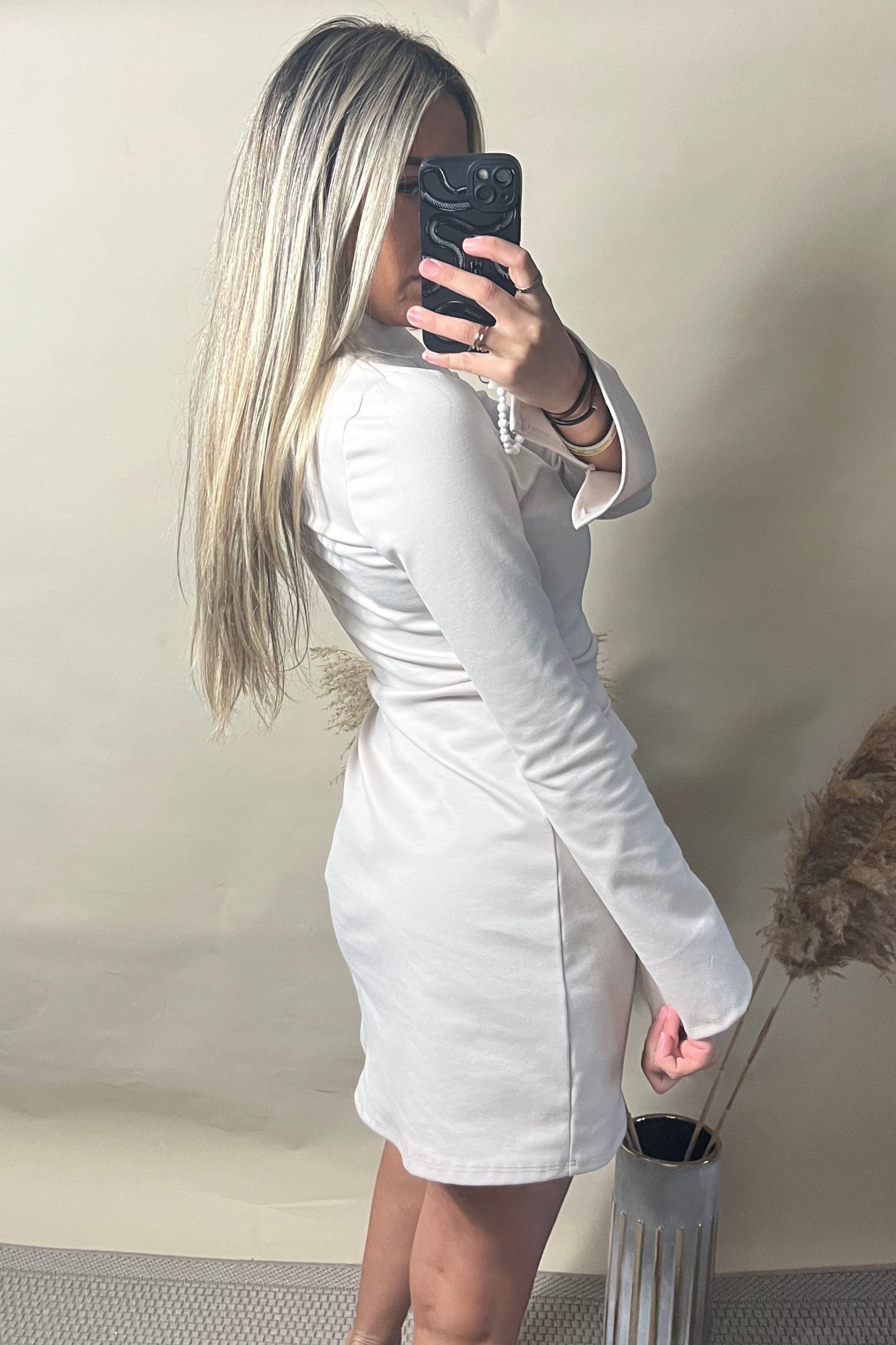 A classy dress with a high neck, a key hole back for ease of getting on. This fabric is thick quality with a fitted style and long sleeves. This is a mini dress with 2 pocket detailing on the front. The colour is a block beige.