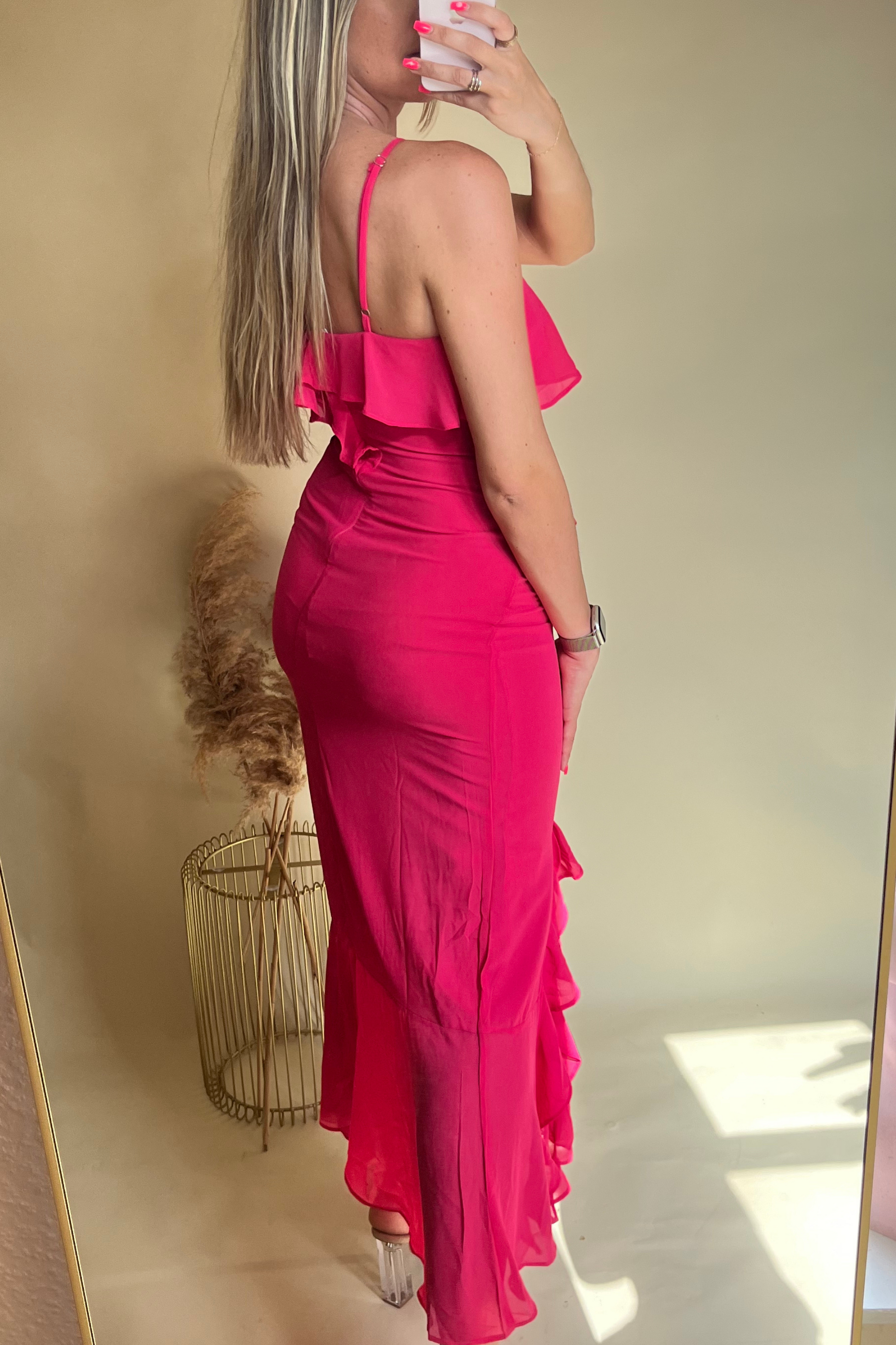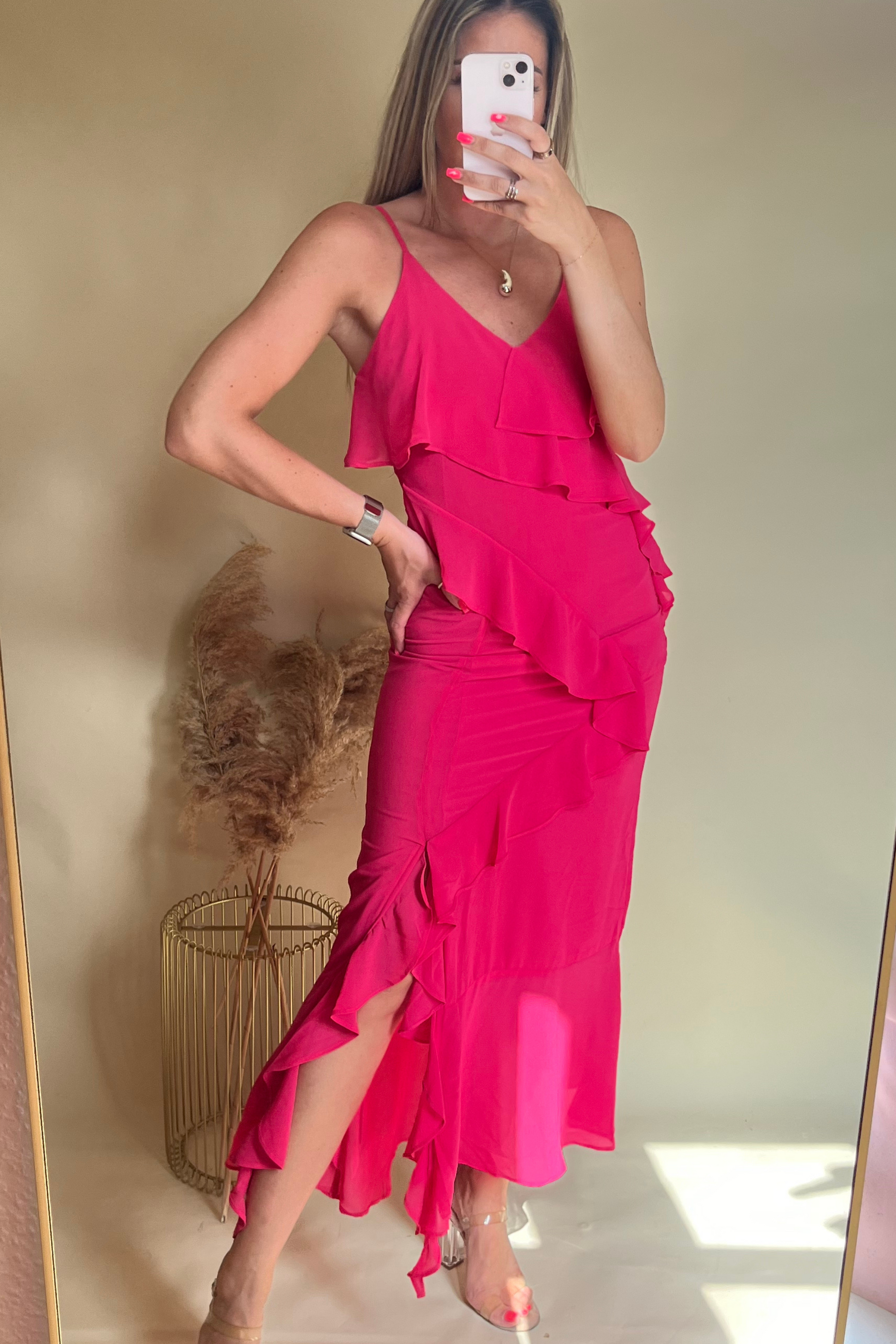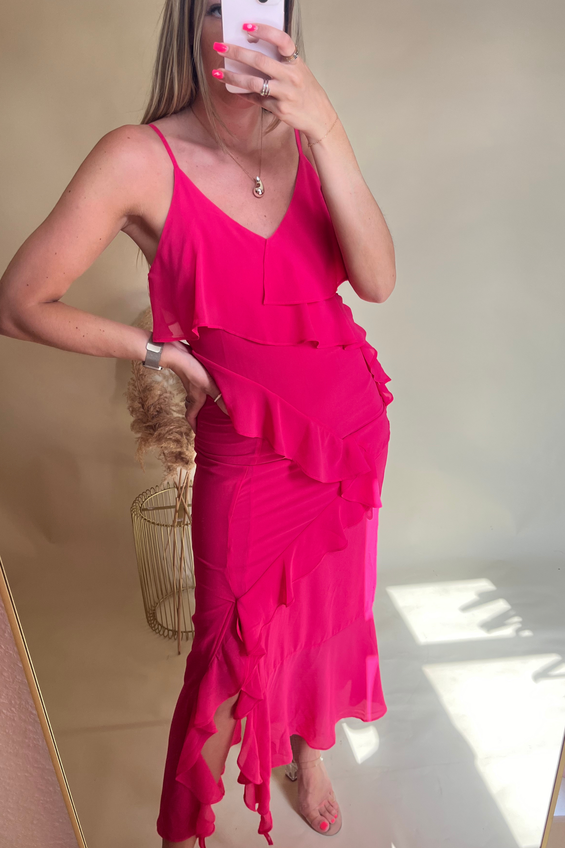 Bright pink ruffle midi dress