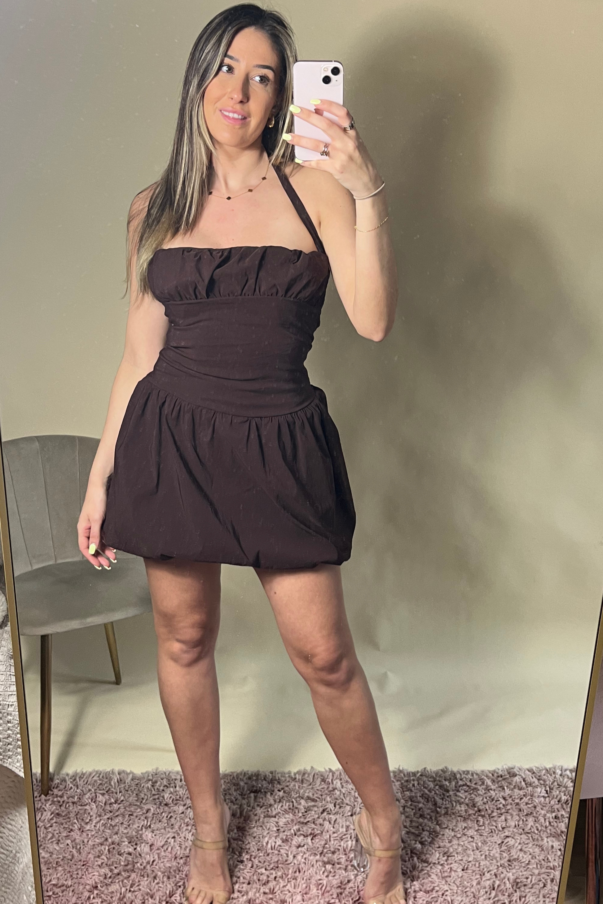 Make a statement in this chic brown halter neck dress with a playful puff skirt. Featuring a stylish halter neckline that accentuates your shoulders and a voluminous puff skirt for a fun and flirty vibe, this dress is perfect for both casual outings and special occasions. The fitted bodice contrasts beautifully with the full skirt, creating a flattering silhouette that adds a touch of elegance to your look.