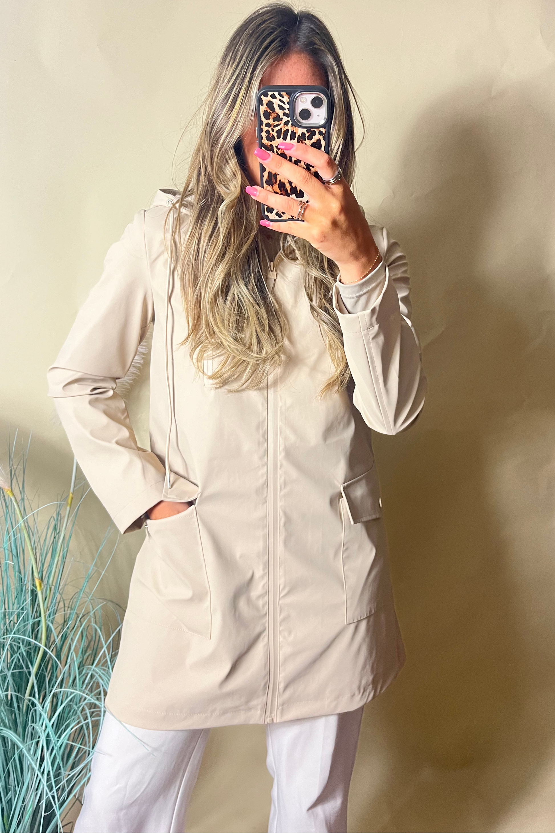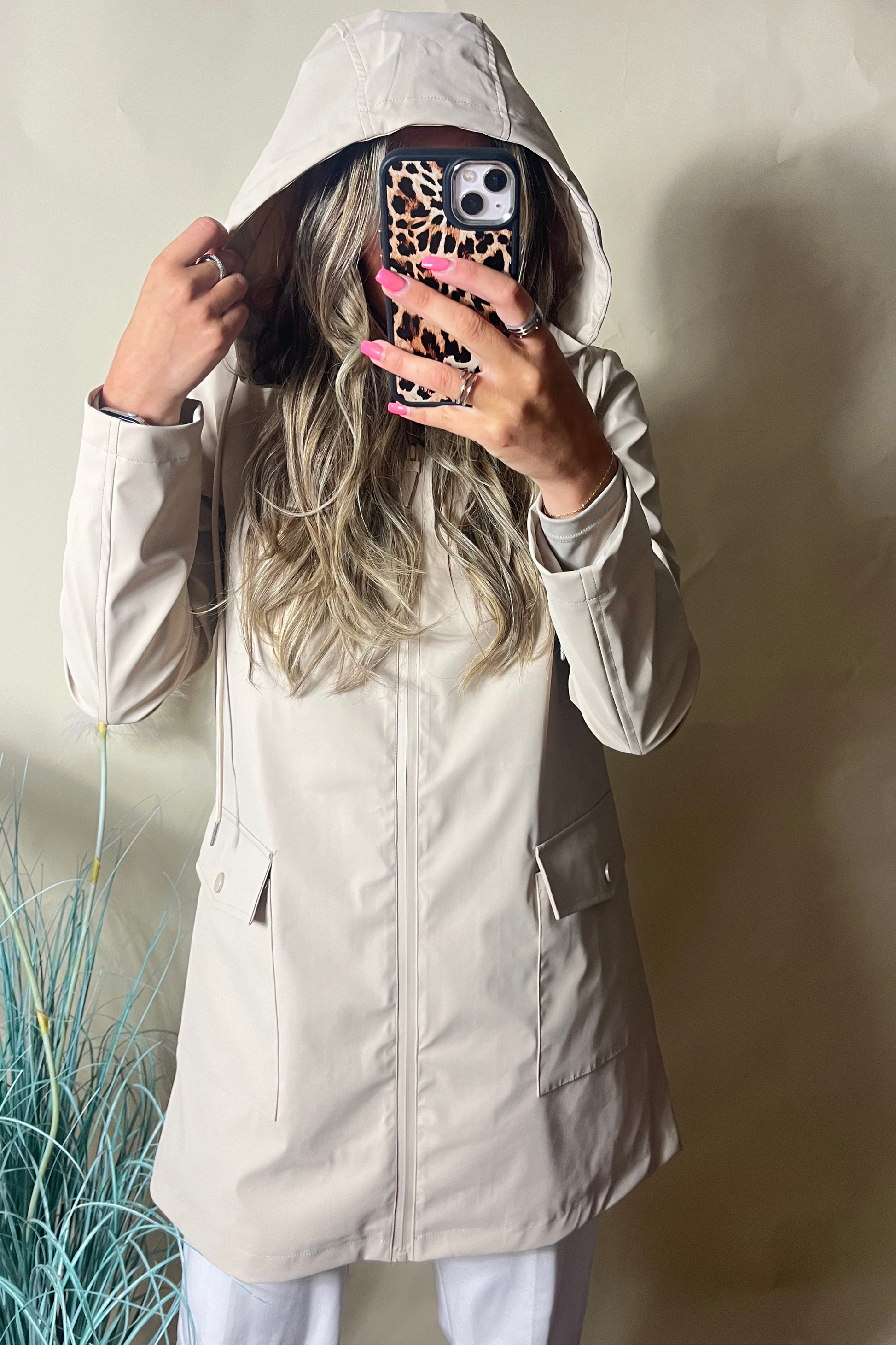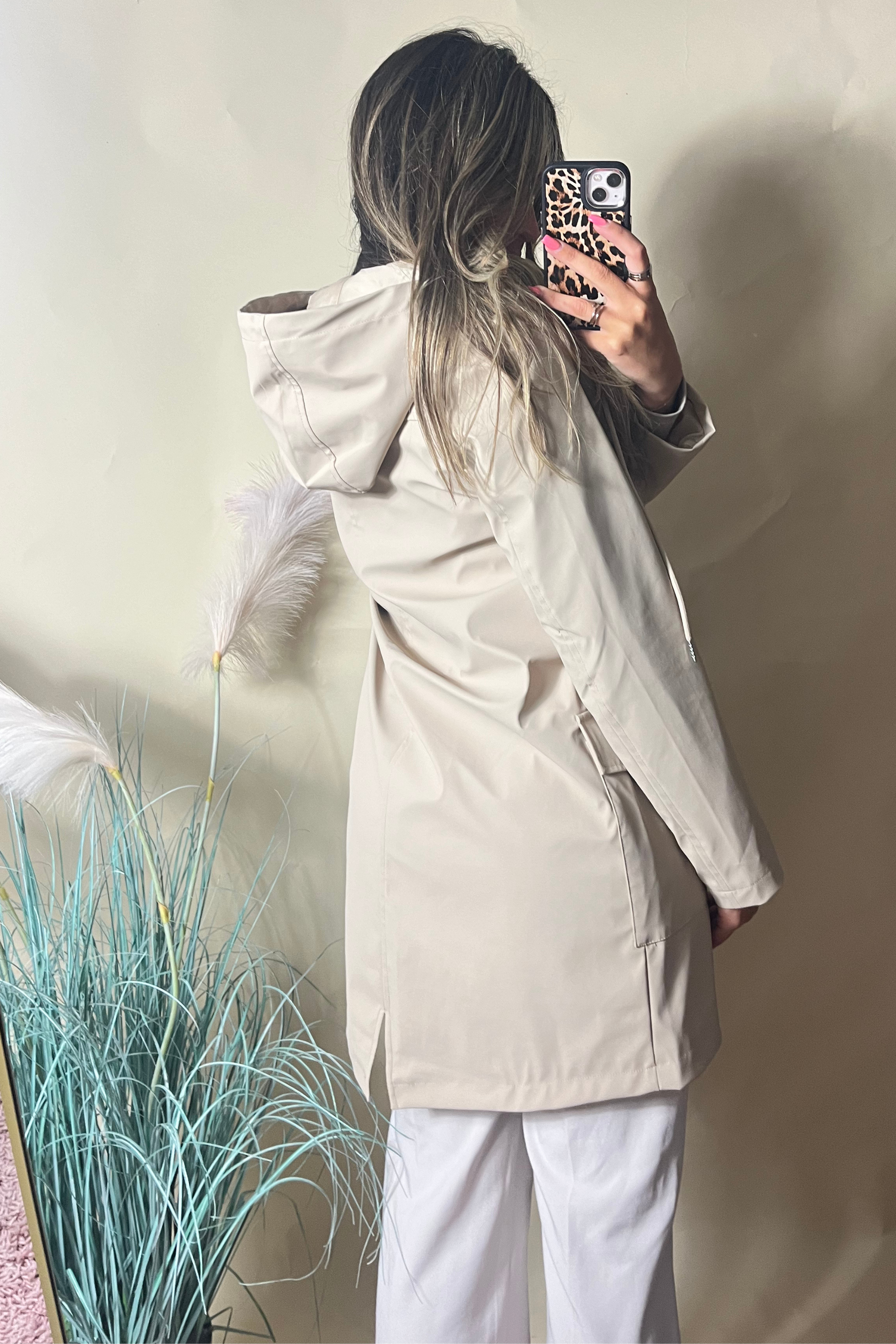 Stay effortlessly chic in our Cream Longline Mac, the perfect balance of style and practicality. This timeless piece features a sleek, longer-length silhouette for added coverage and elegance, complemented by a functional hood for those unexpected rainy days.
