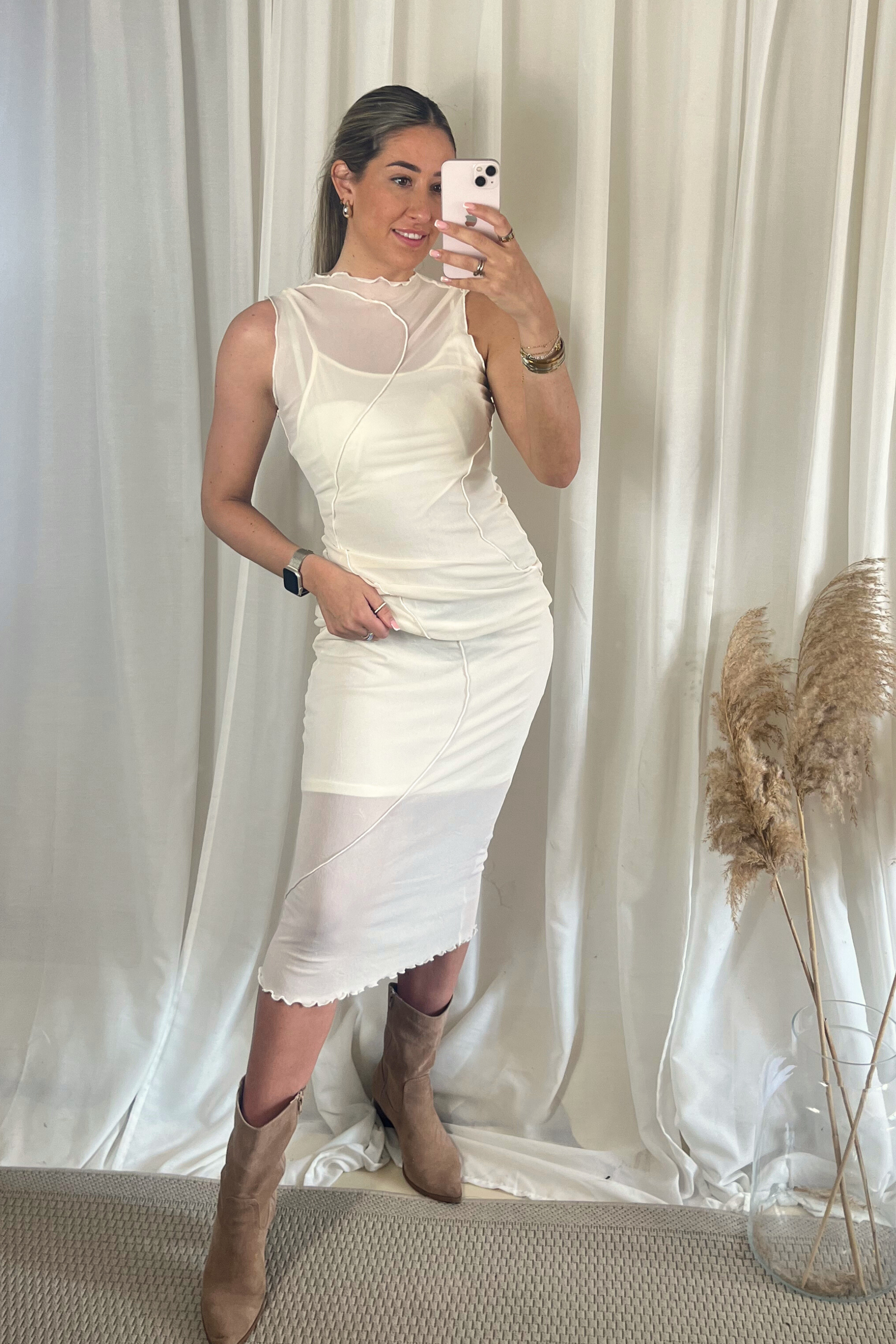 The high neckline adds a touch of refinement, while the maxi length elongates the silhouette, creating a flattering and elegant look. The cream hue complements a variety of skin tones and exudes understated glamour.