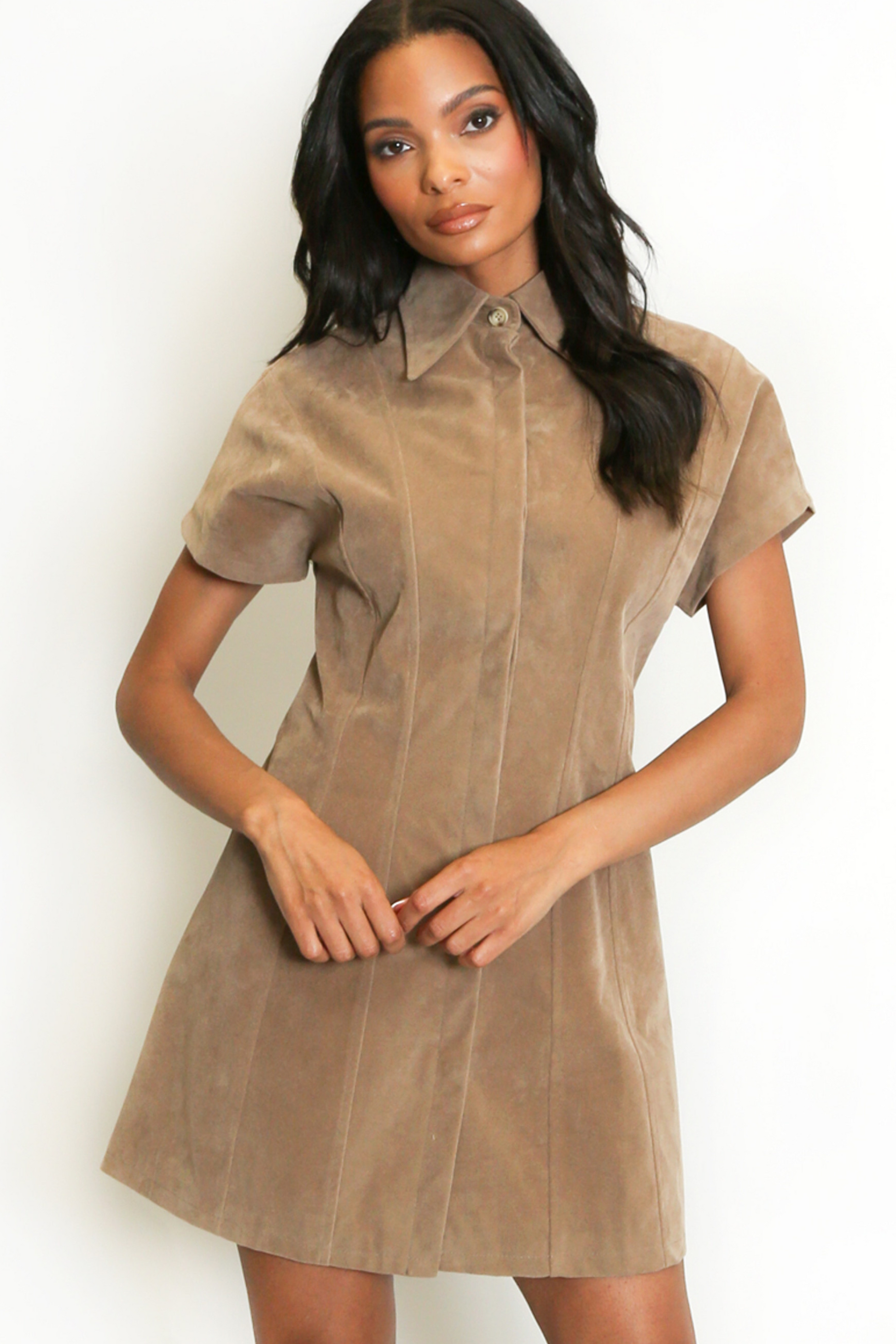 A modern twist on a timeless silhouette, this suede pleated shirt dress brings together elegance and ease. Designed in soft, supple suede, it drapes beautifully while offering a structured yet comfortable fit. The button-up front and classic shirt collar add a tailored touch, while the pleated skirt creates effortless movement and femininity.