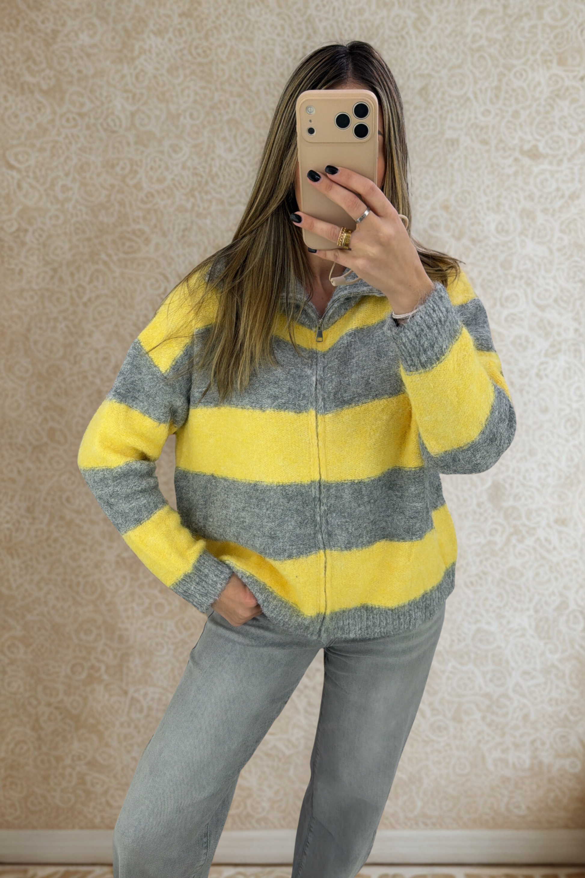 Yellow & Grey Stripe Zip-Up Knit Cardigan